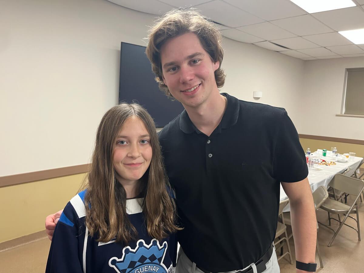 On November 11, 2025, I went to the Hershey Bears Booster Club Meet the Players Night with my mom, my dad, and their friend Carin. This year the tables were set up in long rows soHBBC logo it was a little harder to see where to sit.. I got REALLY lucky, because I got to sit between Aaron Ness, the captain of the team, and my 2nd favorite player, Grant Cruikshank, who brought his new wife Lizzy.