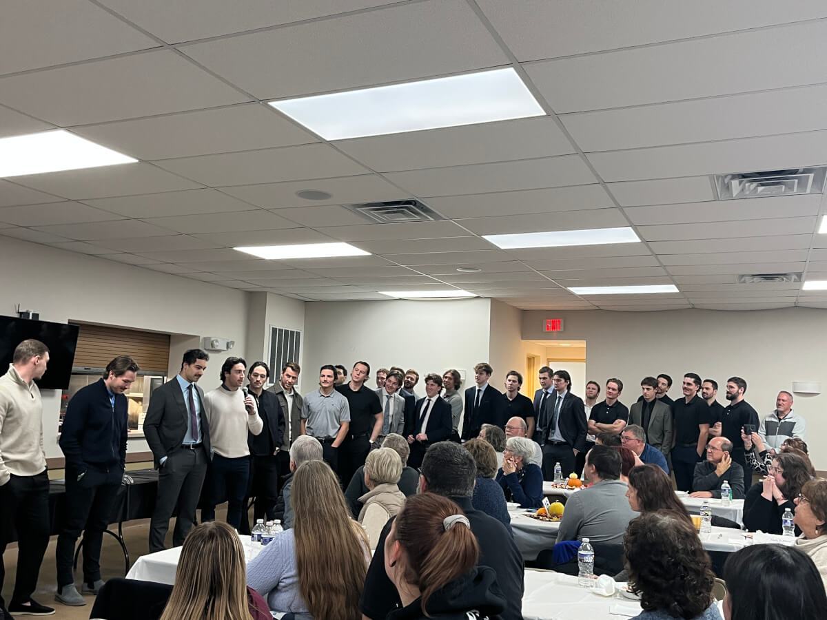 On November 11, 2025, I went to the Hershey Bears Booster Club Meet the Players Night with my mom, my dad, and their friend Carin. This year the tables were set up in long rows soHBBC logo it was a little harder to see where to sit.. I got REALLY lucky, because I got to sit between Aaron Ness, the captain of the team, and my 2nd favorite player, Grant Cruikshank, who brought his new wife Lizzy.